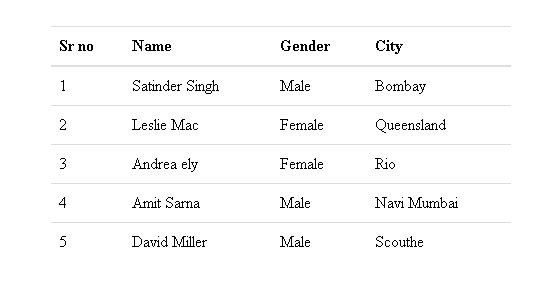 Here we have a list of employees info into variable employees, which displays name, gender, city. Code as written below.var app = angular.module("myapp", []);